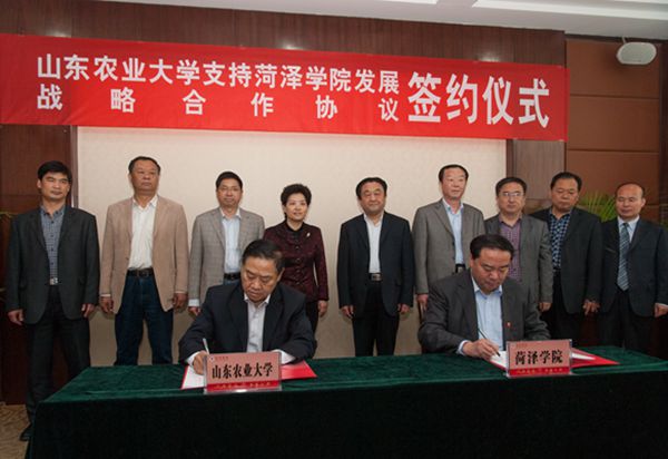 菏泽学院党委书记张存金在致辞中说,山东农大领导一行来校考察工作,进行合作交流,这是学校发展史上的一件大事,是推动学校事业进步的一件好事。山东农大支持菏泽学院发展并签署战略合作协议,必将为实现两校优势互补、资源共享打下坚实基础,为促进菏泽学院事业发展带来良好机遇。菏泽学院一定抓住机遇,加强与山东农大合作交流,并以此为动力,加快推动学校科学发展,使学校在服务经济社会发展中作出应有贡献。