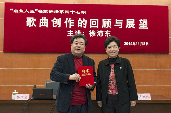 报告会上,徐沛东还与在场的师生进行互动交流,就创作的技巧与激情、歌词创作与歌曲创作、民族传统音乐与现代流行音乐等问题谈了自己的看法。他说,好的作品都是生动而充满激情的,创作需要灵感;技术是作曲的基本功,不能只为追求灵感忽略技术。中国优秀传统文化是中华民族的精神命脉,民族音乐与流行音乐是不矛盾的,如何做好二者的结合文章是我们要认真思考的问题,有海纳百川的胸怀,博采众长才能不断推动传统文化艺术的繁荣发展。