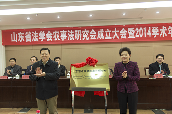 会上,张宪省代表山东农大致欢迎词。明珠代表省法学会宣读研究会成立批复,并主持研究会的机构选举。大会选举产生了会长、副会长、秘书长,邢善萍当选会长。温守信与邢善萍共同为研究会揭牌。山东农大文法学院副院长陈晓军教授作研究会章程的起草说明。