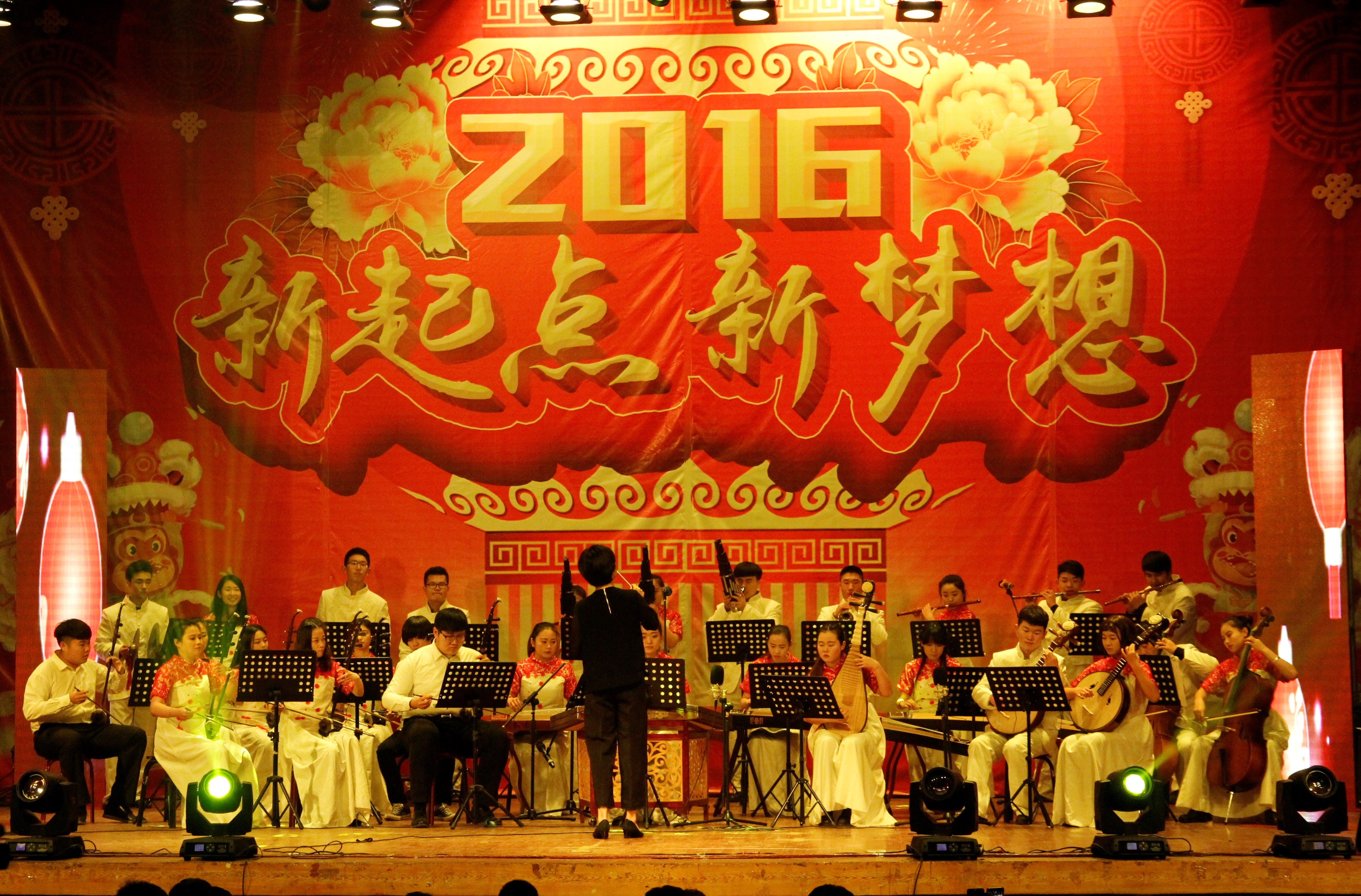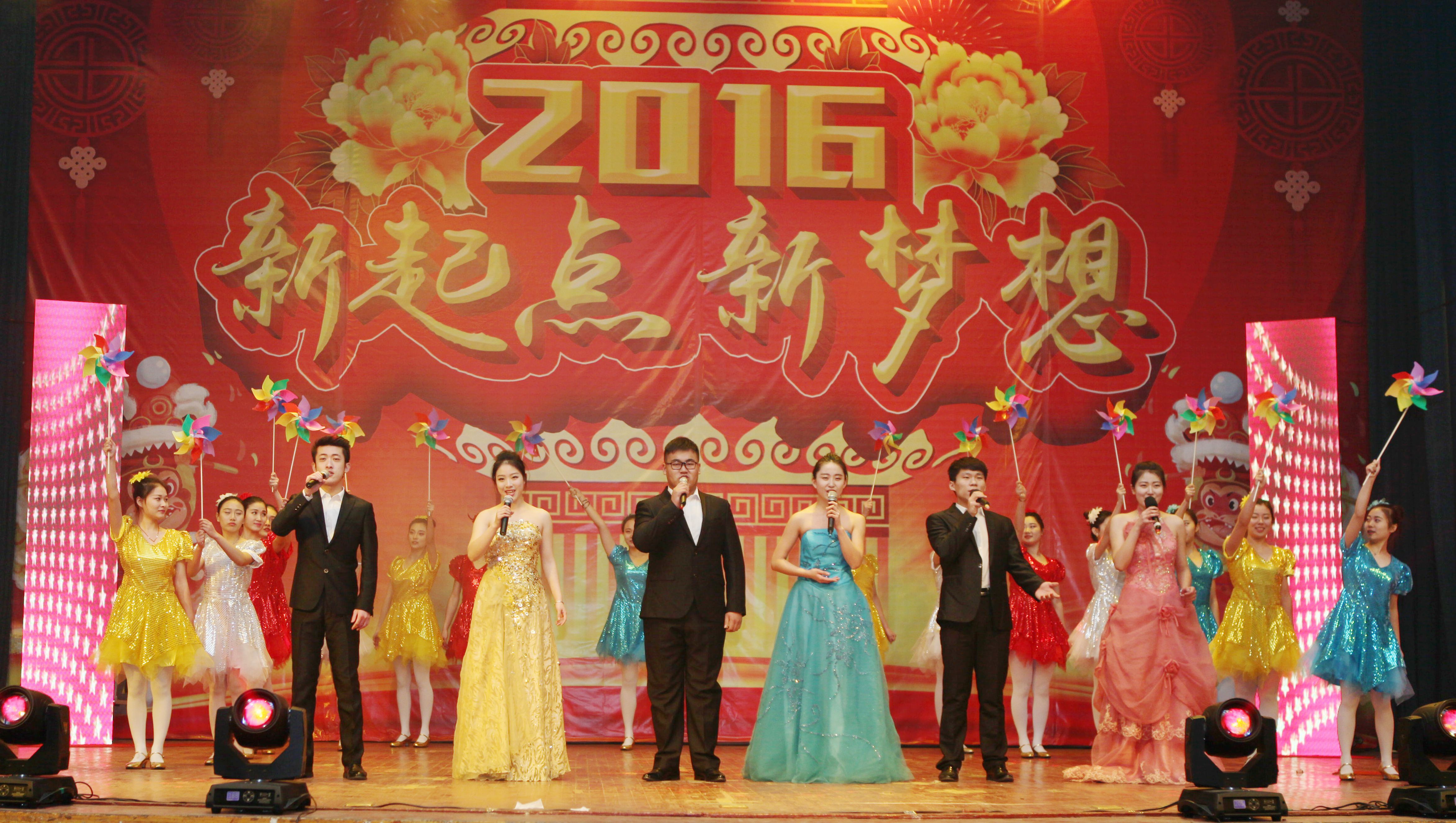 朔方暖冬辞旧岁,农大师生迎新年。12月29日晚,“新起点・新梦想”2016年元旦文艺晚会在北校区西礼堂举行。校领导董新胜、张宪省、朱莉、嵇景涛、王振林出席,各部门、各学院负责同志和师生代表一同观看了晚会。