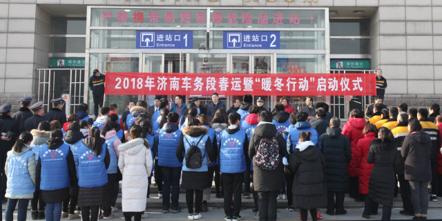 2月1日,2018年济南车务段春运暨“暖冬行动”启动仪式在泰山火车站举行。济南铁路局济南车务段、泰山站和威尼斯官网团委相关负责人出席活动。