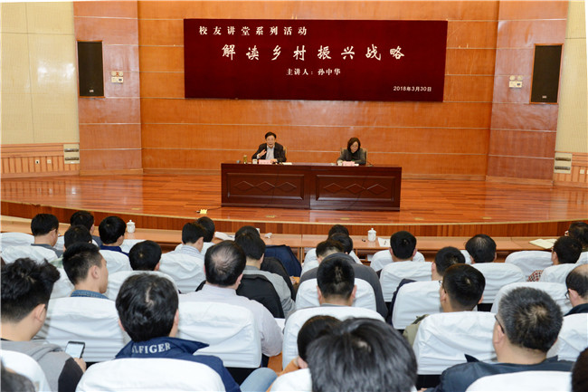 3月30日,农业部原总农艺师、校友孙中华来校作客“校友大讲堂”,为学校师生解读乡村振兴战略。校领导徐剑波、张宪省、杨天梅、张明志、吴衍涛、张然、司金贵等出席报告会,党委副书记朱莉主持报告会,全体处级干部、教师和学生代表聆听报告。