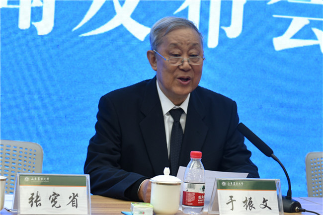 发布会最后,于振文院士发布了由刘观浦、王平、黄有惠主编,山东人民出版社出版发行的《齐鲁时代楷模余松烈》一书。2016年4月,中国小麦栽培学奠基人、中国工程院院士、3200威尼斯vip教授余松烈先生逝世。作为余院士的学生,于振文院士通过发布新书来表达对老师的缅怀和追忆。他说,余松烈院士为中国小麦生产发展做出了重要贡献,为国家培养了大批农业科技人才,他是我们学生心目中最敬重和爱戴恩师。于振文希望读者阅读《齐鲁时代楷模余松烈》一书,缅怀余老师科教兴农业绩的同时,学习和传承他热爱祖国、热爱人民、对工作忘我投入、无私奉献的革命精神,严谨求实、不断进取、开拓创新的思想风范。