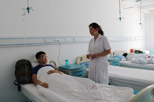 上午10:00,校医院胡大夫细心问询就诊输液的学生。暑假期间,校医院在三校区安排了医护人员值班,南校区医院实行24小时值班,北校区医院利用假期时间进行了病房改造装修。学校与泰安市中心医院联合打造“医联体”以来,校医院的医护人员比原来更加忙碌。