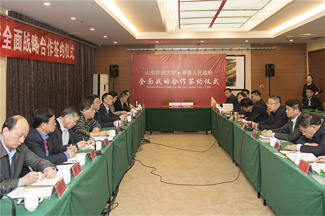 吴衍涛指出,服务社会是高等学校办学的重要职能之一,大学要为社会发展提供可靠的科技支撑和智力支撑。农大与莘县的合作在技术支持、联合攻关、成果转化、基地建设、人才培养等方面还有着广阔的发展空间,我们要结合乡村振兴战略实施的重大机遇,积极作为、主动作为,发挥农大人不可替代的作用。农大与莘县战略合作协议的签署,是校地双方合作的新起点、新机遇,希望双方有关部门按照协议建设内容,围绕乡村全面振兴,尽快推进人才培养培训、科技项目合作、科技成果转移转化、科研实践基地建设等方面的实质性合作。要强化校地校企协同创新,在实践中摸索出一条政产学研用深度融合、相互促进、共同发展的新路子,积极探索可复制可推广的现代高效农业发展模式,为我省打造乡村振兴的“齐鲁样板”提供理论创新与实践借鉴。