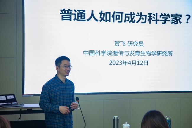 贺飞以“从西南农业大学到中科院遗传所——聊聊一个普通人如何实现自己的科学家梦”为题,从儿时受到袁隆平院士“禾下乘凉梦”的影响立志成为一名农业科学家,求学时期从本科到博士的学习科研经历,10年的海外博士后工作,学成归来就职于中国科学院遗传与发育生物学研究所的经历娓娓道来,用幽默风趣的语言,赢得了现场师生的阵阵掌声,引起学生强烈共鸣。贺飞叮嘱同学们要制定长期和短期奋斗目标,进而围绕目标制定好学习计划,脚踏实地付诸行动,一步一个脚印走出属于自己的人生。同时要练就强大的内心,正确面对挫折和困难,锲而不舍继续向前。要结合自身优势善于在科学研究中发现新的突破。从身行万里的求学游子,到潜心研究的科技工作者,再到将自身所学报效国家,贺飞用自己的亲身经历,诠释了什么是科学家精神。