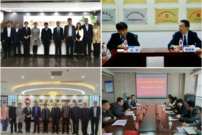 王平一行还先后到山东公允律师事务所、山东泰山蓝天律师事务所、泰安市仲裁委员会等单位参观考察、走访座谈,双方就人才需求、实习实践、合作愿景等达成共识,同时围绕党支部共建、研究生合作培养、课程开发等深入交流。
